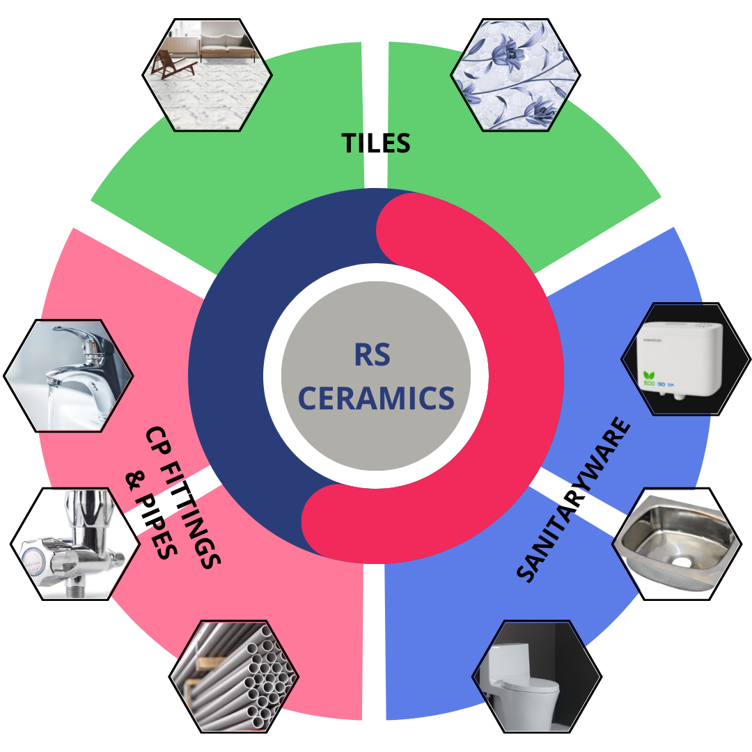 RS Ceramics specializes in tiles, basins, cisterns, toilets, CP fittings, faucets, taps, and high-quality pipes from leading brands like Somany, Prince and WaterChem.