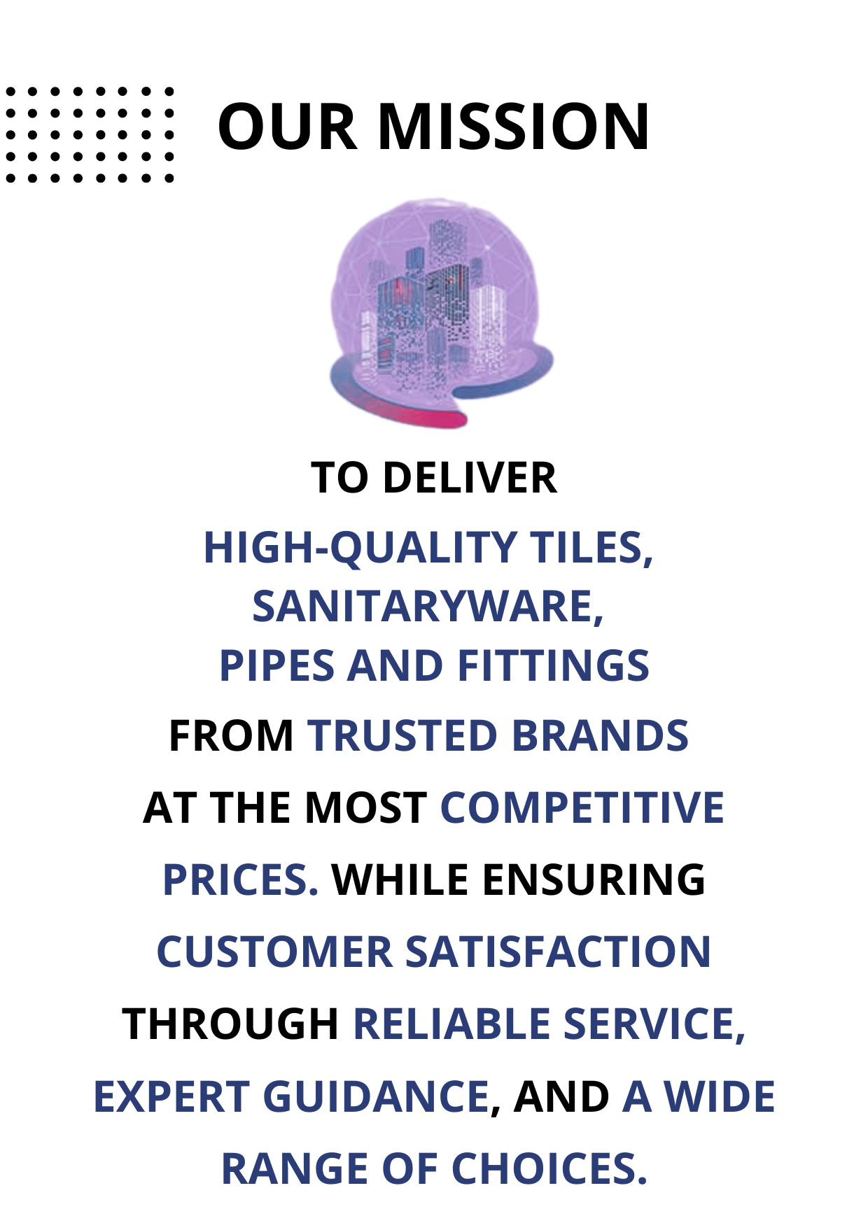 As authorized dealers of leading brands such as Somany, Hindware, Prince, WaterChem, Cera, and Sonet, we ensure that our customers receive only the best in design, durability, and value. Our commitment goes beyond just selling products—we provide personalized guidance, competitive prices, and fast, trusted service to make your building and renovation journey smooth and hassle-free.